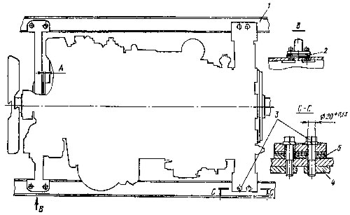 При установке новой опоры проверьте и, при необходимости, отрегулируйте положение оси коленчатого вала дизеля относительно оси верхнего вала коробки передач (см. «Снятие двигателя» и «Установка двигателя»). Разверните отверстия под призонные болты в лапах новой опоры до диаметра 20+0,130 мм совместно с отверстиями в лонжеронах. Закрепите переднюю опору на лонжеронах двумя болтами с пружинными шайбами с каждой стороны. Призонные болты ставьте в свои отверстия (см. рис. 8), не допуская замены их обычными болтами.
