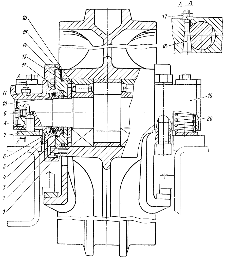 Нагрейте в масляной ванне внутренние кольца 2 ( см. рис. 293 ) роликоподшипников до температуры 363...373 К (90...100 °С) и напрессуйте их на ось 1 до упора в бурт маркировкой наружу. Вставьте ось 8 ( см. рис. 291 ) в ступицу колеса, отверстием под пробку со стороны клейма Н на торце ступицы колеса. Наденьте на лыски оси шайбы 2 до упора во внутренние кольца подшипников. Установите в канавку упорной шайбы 1 уплотнительное кольцо 13 и смажьте его солидолом. Перекручивание 1 кольца не допускается. Наденьте на упорную шайбу регулировочные прокладки 15 (не более шести) для обеспечения осевого люфта оси в пределах 0,10...0,65 мм. Установите упорную шайбу и закрепите ее к ступице шестью болтами с отгибными пластинами. Момент затяжки болтов 60...100 Н-м (6...10 кгс-м). Застопорите болты отгибными пластинами, отогнув их края на грани головок болтов. Установите также и закрепите вторую шайбу. Установите в упорную шайбу прокладку 3 и кольцо 12 торцового уплотнения, совместив вырезы прокладки и кольца со стопором упорной шайбы. Протрите поверхность кольца 12 и смажьте тонким слоем чистого трансмиссионного масла. Протрите поверхность кольца 4, прилегающую к кольцу 12, и наденьте кольцо на лыски оси до упора в кольцо 12. Установите манжету К на ось, надев ее буртом на кольцо 4. Наденьте с помощью конусной оправки на мажету пружинное кольцо 11. Установите, на ось обойму 5 и пружину 6 до упора в манжету.