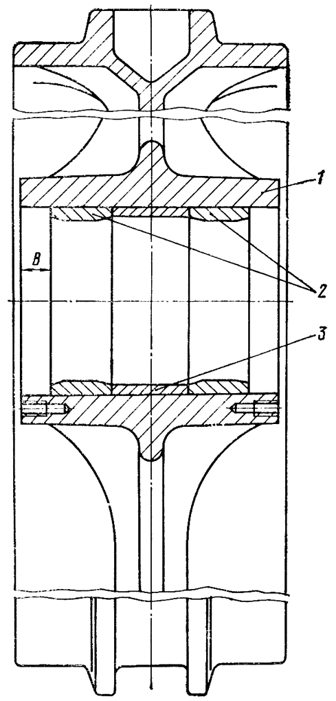 Выньте из колеса дистанционные кольца 16 ( см. рис. 291 ), выпрессуйте с помощью оправки и пресса наружные кольца 2 ( рис. 294 ) роликоподшипников вместе с дистанционной втулкой 3.