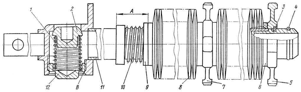 Раскерните резьбу в сопряжении В корпуса клапана и пробки в трех точках на равных расстояниях по окружности. Наденьте на трубу последовательно: пружину 10, шайбу 9, резиновую прокладку, сорок фильтрующих элементов 8, вторую резиновую прокладку, втулку 7, третью резиновую прокладку, фильтрующие элементы, четвертую резиновую прокладку, втулку 5. Сожмите фильтрующие элементы через втулку так, чтобы, верхняя плоскость втулки совпала с нижним торцом канавки на трубе, и установите в канавку упорные полукольца 3, снимите нагрузку. Замерьте размер А, который должен быть 42,5...47,5 мм. Отрегулируйте размер А подбором, количества фильтрующих элементов (но не более 84). Установите в канавку на конце трубы резиновое кольцо 4.
