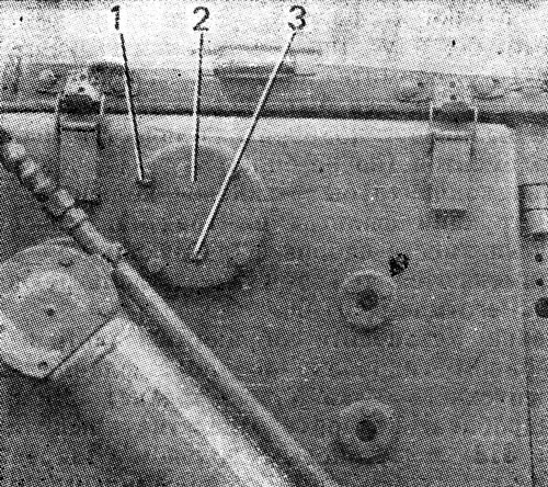 Установите собранный фильтр в отверстие правого гидробака до упора фланца корпуса перепускного клапана во фланец стяжной трубы гидробака. Закройте отверстие крышкой 2 ( см. рис. 318 ) с резиновым кольцом. Закрепите крышку четырьмя болтами 1 с пружинными шайбами. Заверните пробку 3.