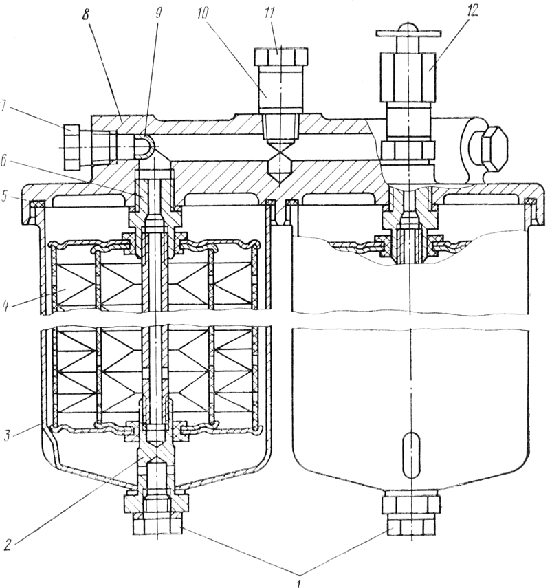 Отверните пробки 1 и выверните стяжные болты 2 из штуцеров в корпусе фильтра. Снимите стаканы 3 и фильтрующие элементы 4 со стержней стяжных болтов. При необходимости ремонта или промывки выверните из корпуса 8 фильтра штуцеры 6, конические пробки 7, болты 11 поворотного угольника, продувочный вентиль 12.