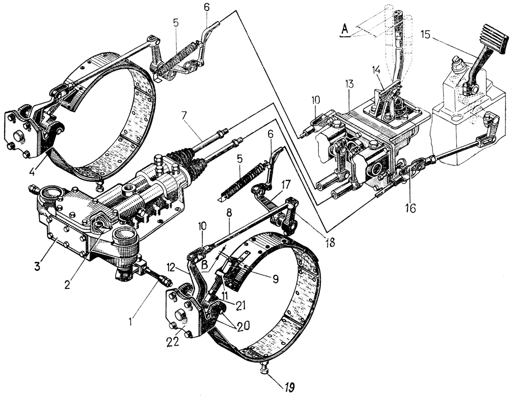 Проверьте регулирование и зазор между тормозной лентой и барабаном бортового фрикциона. При положении двуплечего рычага, соответствующем полному отключению тормоза, верхняя ветвь собственной упругостью должна быть отжата от барабана до упора сферы гайки в гнездо упора. Касание тормозных лент о поверхность барабана допускается на дуге не более 20°, зазор В между регулировочной гайкой и упором должен быть не более 2 мм.