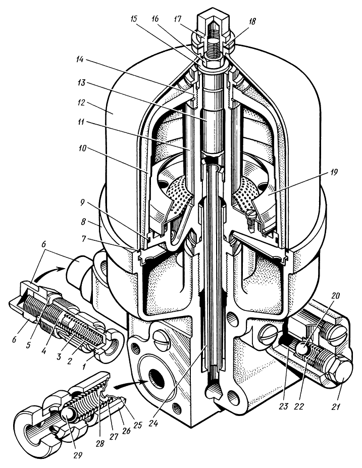 Регулирующая муфта при этом должна соприкасаться с пружиной корректора без деформации пружины (подложить под пружину щуп толщиной 2,8 мм для двигателя Д-160 и 3,6 мм — для двигателя Д-160Б); грузики регулятора прижаты к вертикальному валику, а подвижная муфта регулятора — к роликам рычагов (торец муфты не должен доходить до сухариков грузиков на 1,5—3 мм).