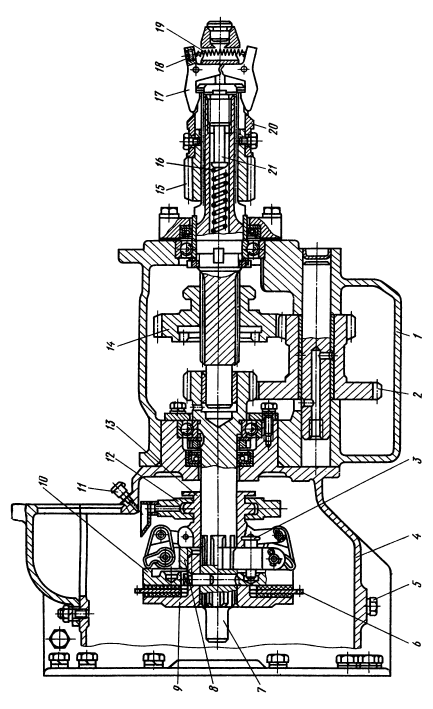На валу редуктора смонтирован механизм включения, имеющий шестерню 15 со спиральными зубьями, вводимую рычагом при пуске ее в зацепление с венцом маховика дизеля. Через эту шестерню пусковой двигатель прокручивает коленчатый вал дизеля. Шестерню в зацеплении с венцом маховика удерживают две защелки 17, сжимаемые пружиной 19. Как только дизель заведется, защелки под действием центробежной силы расходятся, и шестерня механизма включения автоматически,выходит из зацепления с венцом маховика дизеля благодаря давлению зубьев венца маховика на спиральные зубья шестерни и пружины 16 через толкатель 21.
