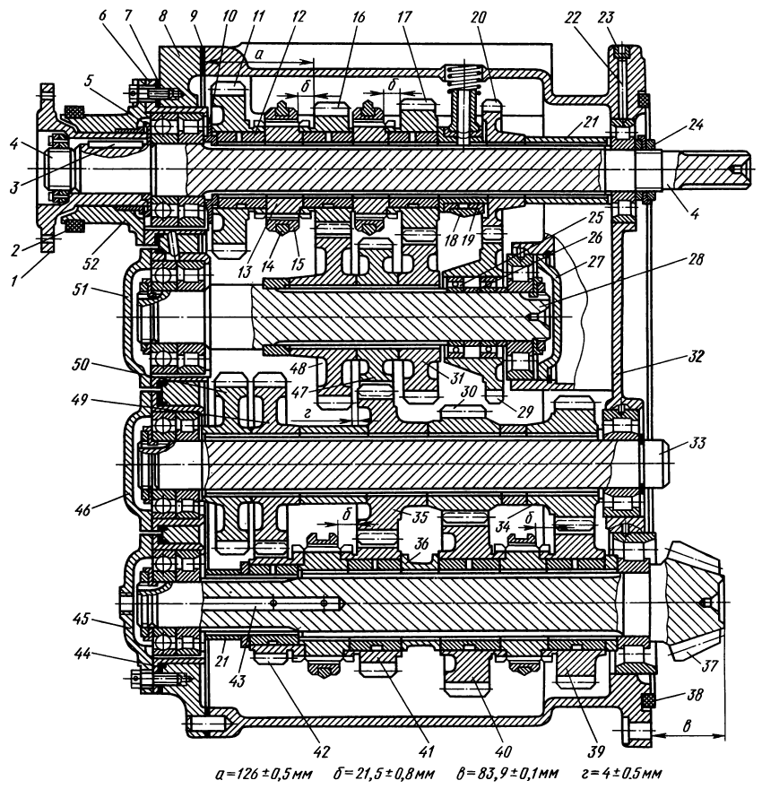 В теплое время года масло идет по большому кругу и охлаждается в радиаторе, который устроен, как и масляный радиатор двигателя. Маслом смазываются следующие точки коробки передач и главной передачи: втулки шестерен (стрелки г и д), правый (стрелка е) и левый (стрелка ж) подшипники.