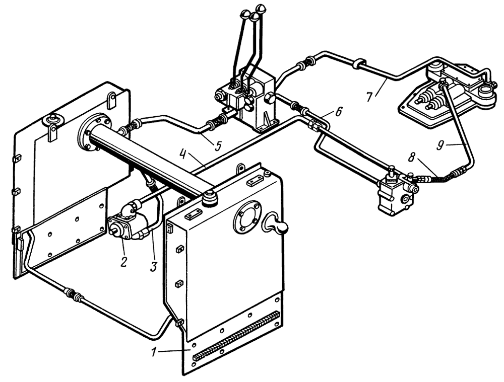 Чтобы уменьшить вибрацию труб при работе трактора, их закрепляют хомутами, подложив под хомуты резиновые прокладки. Хомуты крепятся к узлам трактора.